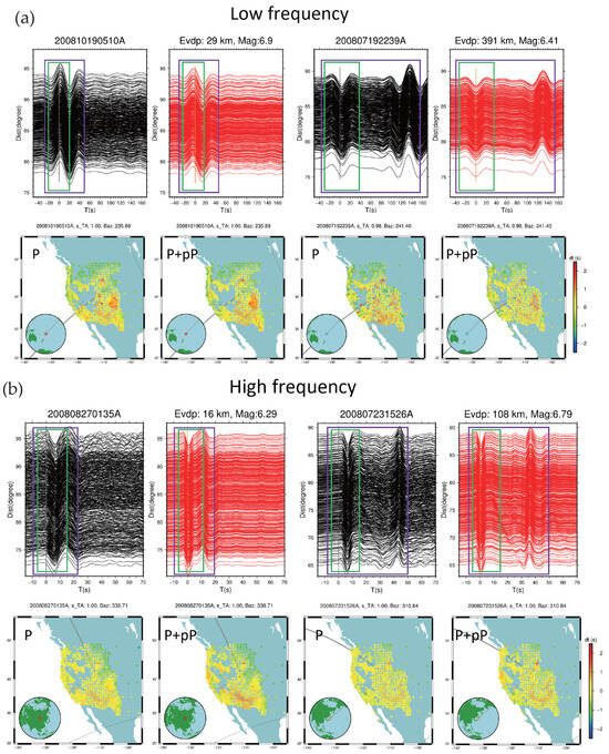 Analysis of depth phase effects on seismic waveforms. (a) Low−frequency analysis. The top row presents waveform data from a shallow earthquake (200810190510A, depth: 29 km) and a deep earthquake (200807192239A, depth: 391 km). Observed waveforms are shown in black, and corresponding synthetic waveforms are in red. The bottom row depicts the outcomes from applying two distinct time windows to the waveform data: the left panel features a window covering only the direct phase (highlighted in green), while the right panel includes both the direct phase and depth phases (indicated by a purple box). The black and orange lines indicate the reference line at T = 0. Travel-time anomalies at receiving stations are represented by diamonds, with colors corresponding to the scale on the right. Insets display the earthquake locations (stars) on a global map, gray lines trace the main wave propagation paths to the TA network, and dotted lines mark the 98° range. (b) Follows the structure and content of panel (a) but focuses on high−frequency data.