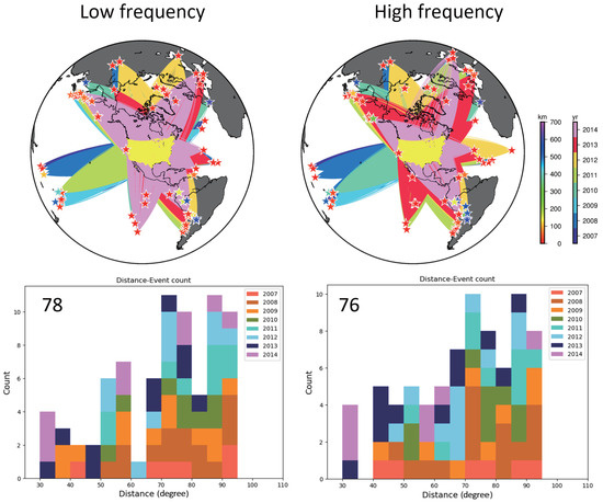 Comprehensive overview of earthquake distributions for P–wave travel-time anomaly analysis across the network area. Top panels illustrate the spatial distribution of earthquake events used to compute average P–wave travel–time anomalies beneath the network, differentiated by low-frequency (left) and high–frequency (right) data. Earthquakes are denoted by stars, with colors representing earthquake depth, as indicated by the first color scale on the right. Yellow triangles indicate station locations. Lines connecting events to stations represent wave propagation paths, with colors corresponding to the event’s year, as per the second color scale on the right. Bottom panels provide epicentral distance and year statistics for the analyzed events, categorized by frequency range. The horizontal axes represent the epicentral distance, while the vertical axes display the count of events, color–coded by the year of occurrence, as indicated in the upper right legend. The total number of events analyzed is specified in the upper left corner of each plot.