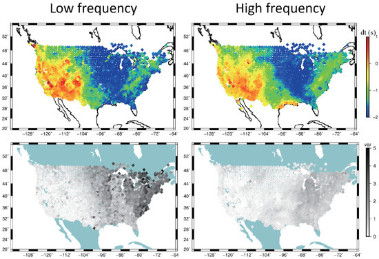 To address potential discrepancies arising from these variations, we refined our methodology by integrating travel-time measurements from approximately homogeneously distributed events across diverse azimuths (Figure 5). Specifically, 78 events were used in the low-frequency analysis, while 76 events contributed to the high-frequency investigation, revealing only slight discrepancies in the event datasets across frequencies (Supplementary Tables S1 and S2). We limited the inclusion of events with epicentral distances beyond 90° in both frequency analyses, thereby minimizing the influence of deep-mantle heterogeneities on our measurements. This integration is crucial for ensuring that data from different events are robustly combined, with all travel-time measurements for each event referenced to the same station, TA.R11A, as shown in Equation (3). Subsequently, we average the travel-time measurements for individual stations across all events (Equation (4)), ensuring that each station recorded at least seven measurements from different events, to construct maps of receiver-side P-wave travel-time anomalies (Figure 4b and Figure 6). This comprehensive coverage of receiver-side travel-time anomalies beneath the USArray enables us to effectively remove the influence of receiver-side upper-mantle effects from our diffracted-wave travel-time measurements [27].