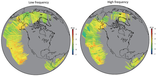 Differential travel–time residual maps for low– and high–frequency data. The corrected travel–time residuals () along diffractive paths at CMB for low–frequency (left) and high–frequency (right) data. The residuals are color–coded according to the scale on the right, illustrating the variance in travel–time anomalies across both frequency ranges.