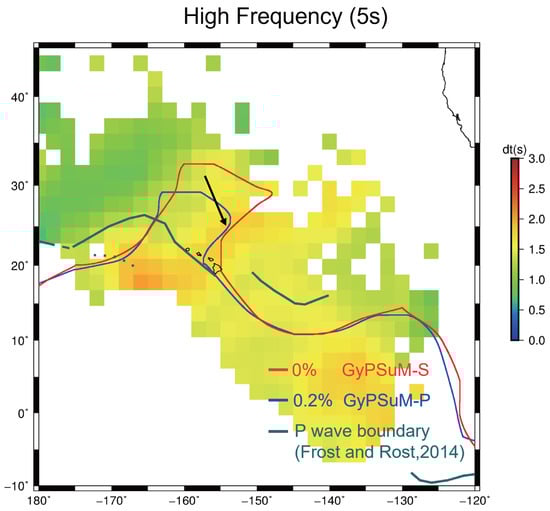 To enhance the interpretability of our travel-time analysis, we partitioned our measurements into 2° × 2° grid boxes, calculating the mean value and standard deviations within each grid to delineate the primary travel-time patterns across our study region. A broad concordance emerges, particularly within the Pacific region (Figure 8), while comparing our findings with a range of published global P-wave and S-wave models [5,19,32,33]. The maps display key seismic heterogeneities, with the mid-Pacific low-speed body (MP), the north Pacific high-velocity body (NP), and the Bering Sea low-velocity anomaly (BS) prominently featuring in both our results and the global models [3,4,5]. High-frequency grid-averaged results reveal that the MP is subdivided into smaller, more distinct structural units. This suggests that what are often perceived as monolithic large low shear velocity provinces (LLSVPs) may actually be composites of more discrete heterogeneities, as previously observed beneath the western Pacific regions [34] or as suggested by recent geodynamic simulations [15,17]. However, a notable divergence is the absence of the low-velocity feature extending southward from the southern Bering Sea in our grid-averaged map, a structure commonly noted in many global models. This difference could be attributed to the elongated diffractive path of seismic waves traversing the north Pacific and the nearly perpendicular orientation of the north–south low-velocity anomalies relative to the direction of wave propagation. Such an orientation and path length might limit these anomalies’ impact on differential travel times, leading to their omission in our averaged results.