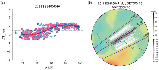 Corrected travel–time differences for event 201112140504A. (a) The relationship and station azimuths for the seismic event 201112140504A. Data from TA stations are shown as blue dots, with pink dots marking specific station pairs that align vertically with the wave propagation direction. Dashed line indicates the mean of the data measurements. Fitting curves for all TA stations and selected vertical pairs are represented by blue and brown lines, respectively. To enhance accuracy, the brown curve is adjusted by trimming two degrees at each end, shown in red, which helps to reduce anomalies at the data boundaries and refine the computation of lateral travel–time variation weights. (b) The weighted lateral spatial gradient of along diffractive paths at the CMB, color–coded as per the scale in the top right corner. The darkest areas suggest a potential boundary between regions of high– and low–velocity anomalies. A dark green line marks the P–wave velocity boundary identified by Frost and Rost [36]. The underlying tomographic model is DETOX-P3, with velocity perturbations shown in colors matching the scale at the bottom right.