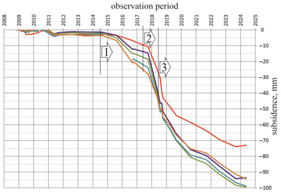 - Makarov, A.B.; Mosyakin, D.V.; Tolysbaev, A.K. Movement of rocks during repeated development of flat ore deposits. In Proceedings of the VIII International Conference “Innovative Directions in Design of Mining Enterprises. Geomechanical Support for Design and Support of Mining Operations”—St. Petersburg Mining University, Saint Petersburg, Russia, 15–17 January 2017; pp. 63–70. [Google Scholar]