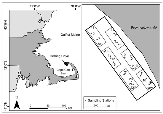 Sampling stations (1–24) within the study area, on the northernmost tip of Cape Cod in Provincetown, MA, USA. The (left panel) depicts the regional setting of the study area, while the (right panel) illustrates the layout of the stratified random sampling design.