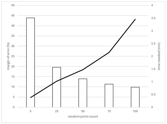 At constant alpha value (α) of 0.05 and a binomial probability (p) of 0.5, margin of error (white stacks on y-axis) decreased with increasing points analyzed while time needed for analysis increased (second y-axis).