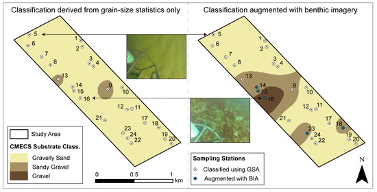 A comparison of substrate maps based on grain-size analysis (GSA) and GSA augmented with benthic imagery.