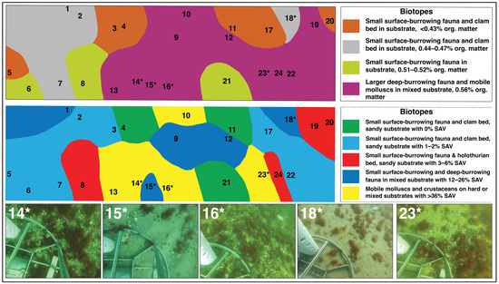 Biotopes calculated without benthic imagery (n = 4) (upper panel) and calculated with benthic imagery (n = 5) (center panel). Five stations were misclassified (pictures in lower panel).
