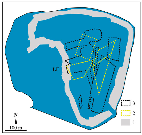 Figure 5. Map of the LF showing the private properties’ extension and the actual area of the lake covered by farming structures. It is possible to observe the lack of correspondence among the actual area extension of farming structures (2) and the original authorized limits (3). Legend: (1) Private properties; (2) Actual areal extension of farming structures; (3) Original authorized limits.