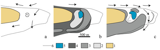 Figure 6. Geomorphological phenomena and evolution responsible for shaping the edge of the peninsula of Cape Peloro, during the Late Pleistocene-Holocene time span [29]. (a) Deep whirl excavation because of cold currents (arrows) (Late Pleistocene). (b) Littoral sand bar shoal external to the paleo LF (Pleistocene-Holocene transition). (c) Littoral warm current circulation about 11,000–9000 years B.P. (Holocene) [29]. Legend: (1) Middle Pleistocene substrate. (2) Paleo LF. (3) Coastal deposits. (4) Marine deposits. (5) LF. (6) Actual coast line.