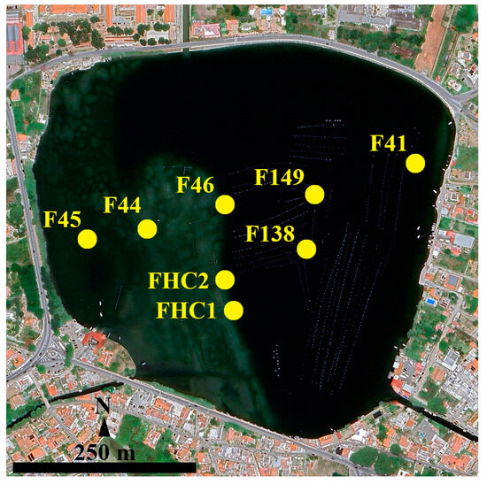 LF is a small brackish coastal lake showing a peculiar sub-circular shape, covering an area of about 263,600 m2 (Figure 5). The maximum length (ENE-WSW) and width (N-S) are 600 m and 562 m, respectively. The boundary of the lake is entirely anthropized, being mostly delimited by cemented ramps, streets, and small buildings facing directly toward the lake. The lake is lightly connected to the Ionian Sea through an artificial canal (Canal Faro), about 8 m wide and 425 m long, opening in the Strait of Messina. During the summer, an artificial connection with the Tyrrhenian Sea (Canal degli Inglesi, about 8–10 m wide and 182 m long) is occasionally opened for receiving marine waters to improve the water chemical-physical quality of the lagoon, thus indirectly favoring the local mussel farming activities. Other indirect connections with the sea occur through the Canal Margi (about 8–12 m wide and 904 m long), connecting the SW side of LF with the close LG, on its turn connected with the Ionian Sea through the Canal Due Torri (about 10 m wide and 302 m long) [1].