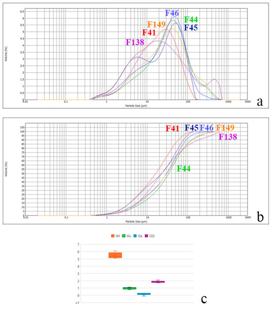 The analyses of the fine grain sizes (silts and clays) [<4 phi (62.5 µm)], after treatment with sodium hexametaphosphate, were performed by means of a diffraction particle size analyzer in wet conditions. The instrument was a laser diffraction particle size analyzer (Mastersizer 2000, Malvern Panalytical Ltd., Malvern, UK) able to measure particles in the size range 0.02–2000 µm. PSA data were expressed in frequency and cumulative per-centage curves. The statistical parameters (mode, inclusive mean, kurtosis, skewness, sorting) were automatically provided by the system Mastersizer 2000.