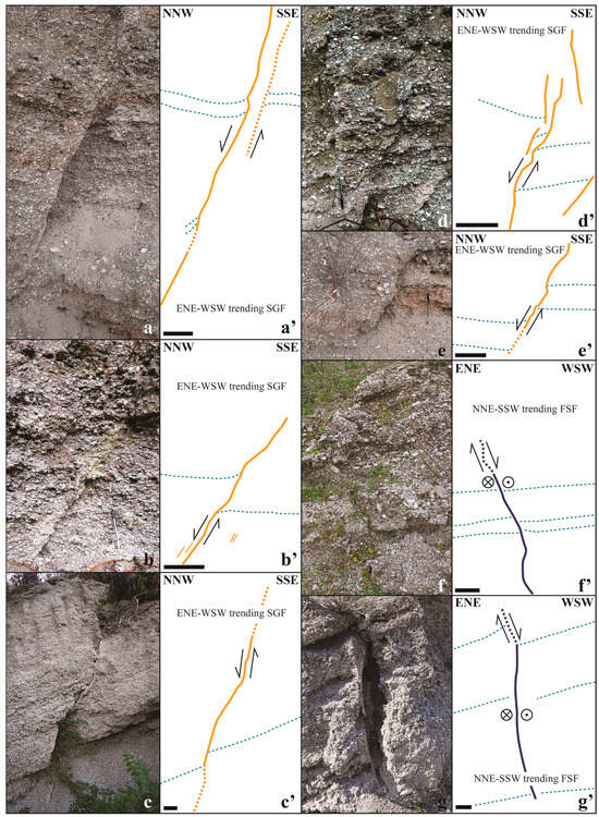Analyzing the main trends of structural data reported in the major CPCL geological-structural sketch maps [19,20,30,31,32,33,34,35,36,37,38], at least three main fault systems may be recognized. The main macroscale fault systems shaping this landscape are as follows: