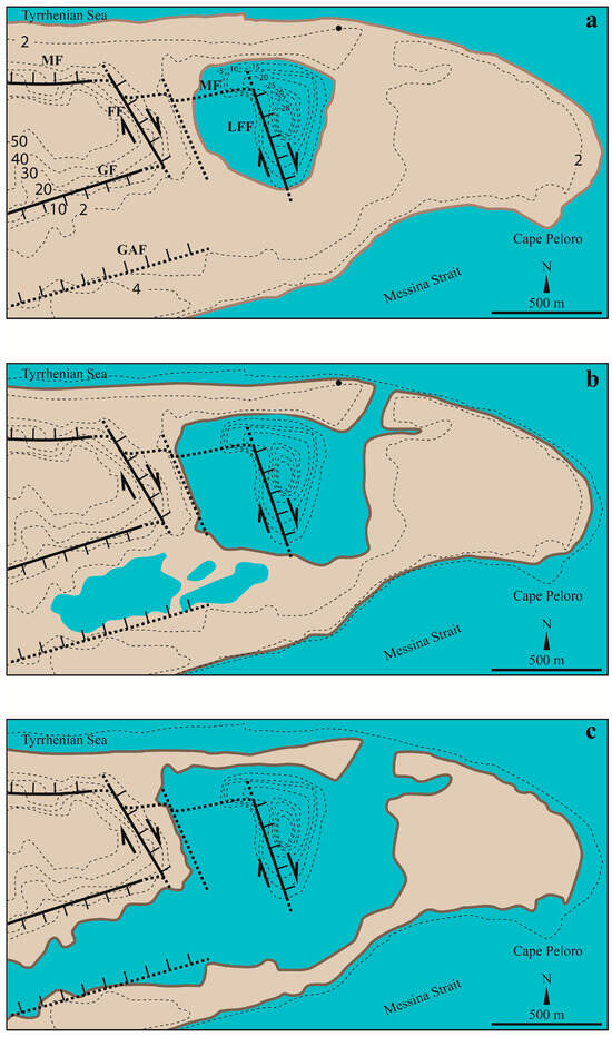 Segre et al. [29] explained the origin of the deep-seated funnel shape of the LF as depending exclusively on geomorphological phenomena, occurring during the Late Pleistocene-Holocene time span, related to cold currents causing a deep whirl excavation (Figure 6a) of the sea bottom in front of the Faro-Pelorus headland. The eastwards littoral warm currents (Figure 6b), occurring after the previous cold paleocurrents, after the Pleistocene-Holocene transition, determined the formation of a littoral sand bar shoal external to the paleo Lake Faro (Figure 6b), lying on a flat sea floor composed of pebbles and conglomerates. Finally, this littoral warm current circulation became stable about 11,000–9000 years B.P. [29] (Figure 6c).