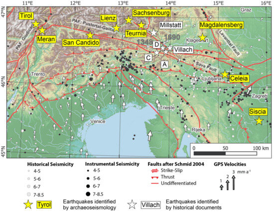 Sites studied for archaeoseismological evidence for earthquakes of the past two millennia along the Periadriatic Line fault system. Base map after [17], modified. A—Arnoldstein, C—Camporosso, D—Dobratsch. Main faults are based on the Active Faults of Eurasia Database—AFEAD. Earthquakes in 1000–1899: SHARE European Earthquake Catalog. Earthquakes in 1900–2006: SHARE European Earthquake Catalog.