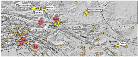 Faults and archaeoseismological sites (yellow stars) in the Periadriatic Fault system. Celeia could be affected by the Sava, Šoštanj or the Labot faults. Magdalensberg is near the Karawanken Thrust fault and the strike-slip Šoštanj Fault. Villach is at the junction of the Gailtal segment of the Periadriatic Fault and the Mölltal Fault. Arnoldstein is straddling the Gailtal Fault. Millstatt, Teurnia, and Sachsenburg are in dangerous proximity to the Mölltal Fault. The white star marks the epicentre of the 1348 Villach earthquake at the Camporosso Pass along the Fella-Sava Fault. Earthquakes shown (orange dots) are Mw ≥ 5.0 (after [7], modified).