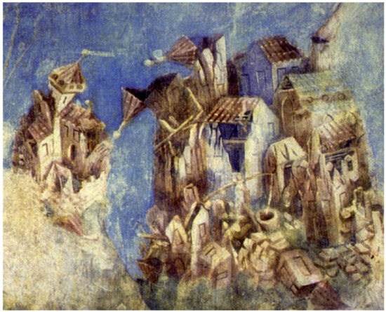 Evidence. The destruction of the Benedictine monastery in Arnoldstein by the earthquake of 1348 was depicted on a mural in the Lady Chapel in Karlstein castle near Prague (now Karlštejn in Czechia) (Figure 8). The painter, Nikolaus Wurmser of Strasbourg, created it as a part of an Apocalypse cycle on the order of Emperor Charles IV. It is one of the oldest depictions of an earthquake [70]. The monastery was first mentioned in charters in 1106, and the existence of St. George church was recorded in 1316 [71] (pp. 20–22). It is widely accepted that the painter has seen Arnoldstein in ruins: some of the details, e.g., corner expulsion on at least two buildings, support the authenticity of the image.