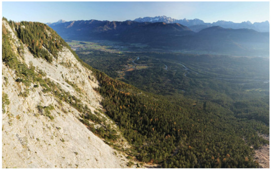 Evidence. The Dobratsch Range is 1300 m higher than the valley of the Gail River to the south. The steep slopes of fractured limestone and dolomite were frequently subjected to landslides in post-glacial times [72]. Six of these are attributed to the 1348 earthquake [72]. The Rote Wand landslide was the most extensive (Figure 9): the mass movement transported and deposited 100 million m3 of debris on the fluvial plain, damming the river Gail, which yielded additional destruction [73].