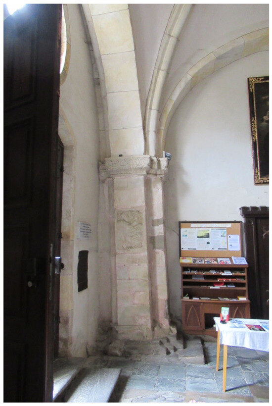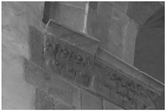The building seems to be intact. However, we noted that the eastern wall of the northern transept contains a frieze block, which shows clockwise rotation, a typical feature of seismic shaking (Figure 16). Similar, rotated blocks were widely documented in buildings that suffered seismic damage (e.g., in Llorca, Spain, in 2011 [90] (Figure 59b); in Tartous, Syria: [91] (Figure 6.55); in Macchu Picchu, Peru: [92] (Figure 3); in Manjal, Gujarat, India [93] (Figure 5c); in Ateret, Israel: [94] (Figure 1h)).