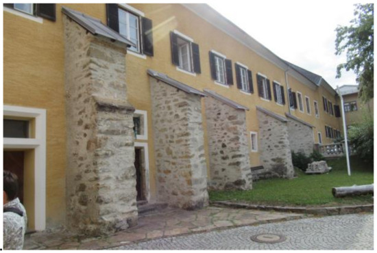 Evidence and dating. St. Margaret church outside the ring wall. First mention in charter: 1425. Parish from 1449. Construction was completed in 1510, marked by a building inscription above the west gate. Late Gothic, three aisles. Massive buttress at the SW corner and along the aisle (Figure 13 and Figure 14) [71,75]. The 1690 AD earthquake might be responsible for the structural damage, which needed reinforcement by buttresses.