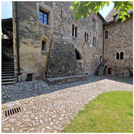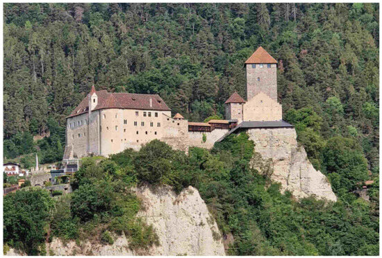 - Mittermair, M.; Hauser, W. Die Baugeschichte von Schloss Tirol im Mittelalter. In Schloss Tirol. Bd. 1. Baugeschichte. Die Burg Tirol von ihren Anfängen bis zum 21. Jahrhundert; Hauser, W., Mittermair, M., Eds.; Südtiroler Landesmuseum: Schloss Tirol, Italy, 2017; pp. 136–285. [Google Scholar]