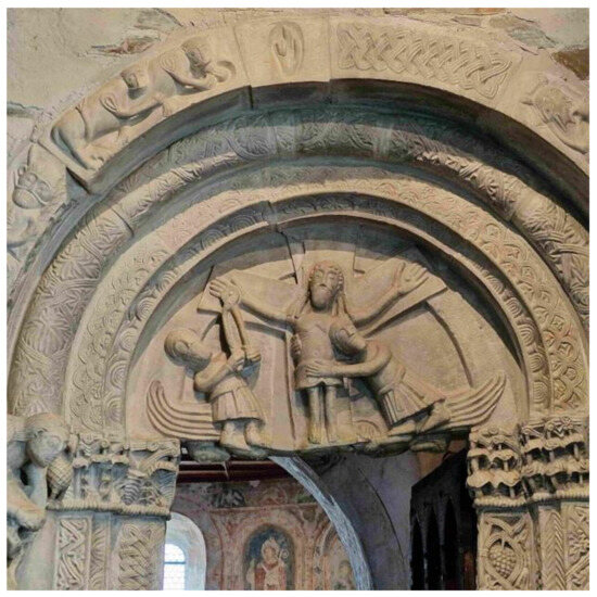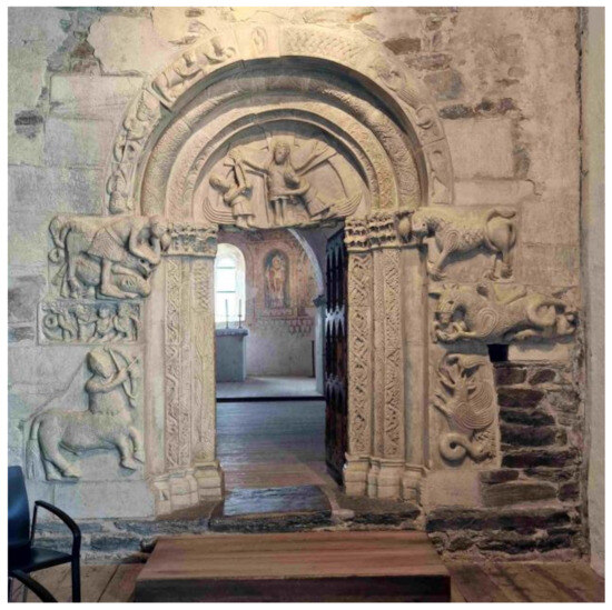 Tirol castle (German Tirol, Italian Tirolo, English Tyrol) [95]. The castle was the seat of the aristocratic family (Burggraf), which ruled Tyrol for centuries. The buildings and defensive walls stand on lithified fluvioglacial sediments; the cliffs below the walls are rock solid (Figure 17) [96] (p. 552). The earliest construction periods are not dated. A second phase is dated to 1138 AD by dendrochronology. As this contains walls built previously, those are probably the results of a late 11th-century construction period. For us, the most important parts of the building are two majestic portals of the castle chapel: based on artistic and iconographic arguments, these were built shortly before 1138.
