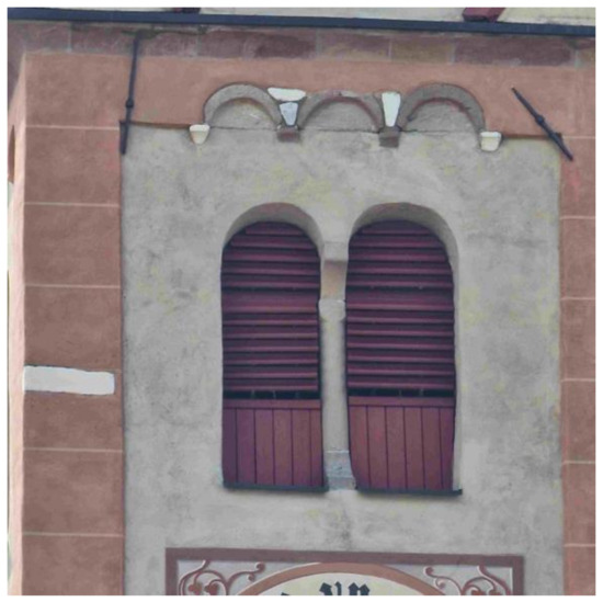 The Benedictine monastery was founded in 1070/1080. The early history of the church is mostly unknown. However, minor remarks in chronicles and charters provide ample evidence for environmental catastrophes, like fires. The monastery church (today, St. Salvator and All Saints parish church) was built in early Romanesque style between 1122 and 1200. The westwork with the towers and the ornamental portal was built during the rule of Abbot Heinrich I (1166–1177). Today, the frontal part of the porch is dangerously tilted outwards, and the columns of the main gate are displaced (Figure 10 and Figure 11). The opening of the porch between the towers was walled up in late Romanesque—early Gothic style (Figure 10) [74,75]. The Romanesque basilica was rebuilt and vaulted in Gothic style between 1511 and 1519 [76].