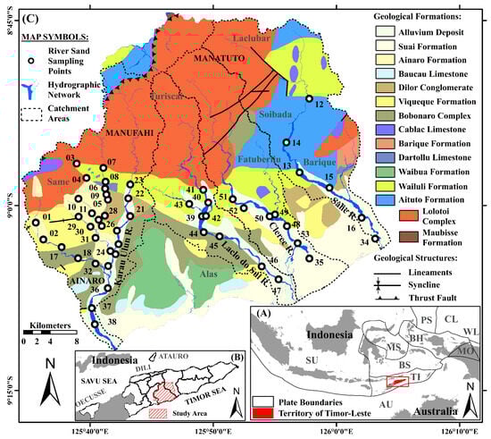 (A) Geographic map of Timor-Leste and the plate tectonic boundaries of Southeast Asia. Bold greyish-black lines are used to delineate the borders of the Sunda (SU), Australia (AU), Timor (TI), Banda Sea (BS), Molucca Sea (MS), Bird’s Head (BH), Philippine Sea (PS), Caroline (CL), Woodlark (WL), and Maoke (MO) plates (adapted from Bird [54], Pisut [55], Poiata et al. [56]). (B) The geographical location of the study area and its surroundings. The municipalities of Timor-Leste are delineated by heavy black lines (adopted from Pisut [55]). (C) Geological formation map and the distribution of river-sand sampling points in the study area (adapted from Bachri and Situmorang [57], Partoyo et al. [58]).