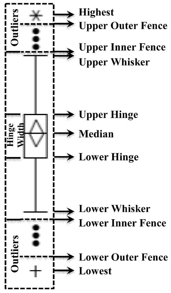 The distribution plots, which involve the joint application of several graphs and diagrams, such as normal quantile plots, boxplots, and histograms, are focused on visualizing, simplifying, and clarifying the distribution and characteristics, or any deviations, in the studied geochemical elements that could be attributed to the contributions of the underlying lithologies or mineral deposits [80,85,86,87]. The boxplot method is also one of the most precise approaches for defining anomaly thresholds in exploration targeting, particularly when dealing with complex geochemical data, including non-normal distributions, spatial heterogeneity, and background variability. This approach identifies outliers as values falling beyond 1.5 or 3 times the interquartile range (IQR) above the third quartile or below the first quartile, helping in the detection of outliers or extreme values within a distribution and making it especially effective for skewed geochemical data. Figure 2 shows the elements of boxplot, which categorizes a set of geochemical element data into five reliable classes as follows [85]: (a) the lowest-lower whisker is classified as extremely low background; (b) lower whisker-lower hinge is labelled as low background; (c) lower hinge-upper hinge is defined as background; (d) upper hinge-upper whisker is considered high background; and (e) upper whisker-highest is classified as an anomaly. In addition, the upper inner fence was defined as the threshold for separating the background from anomalous values.