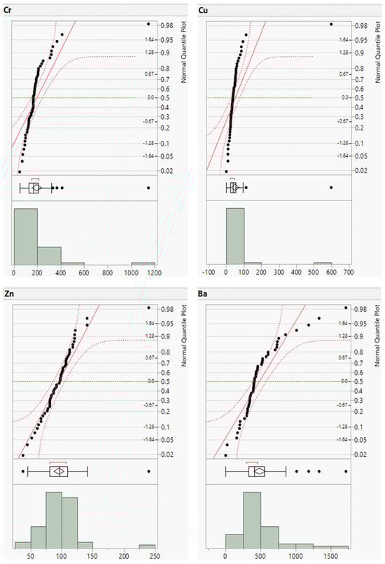 To complement the descriptive statistics, distribution plots for the raw geochemical data of the river sands were generated. The distribution plots for Cr, Cu, Zn, and Ba are presented in Figure 3 and those for the remaining elements are provided in the (Appendix A, Figure A1 and Figure A2). The distribution plots for the analyzed geochemical elements primarily exhibited a normal distribution; however, those for Cr, Cu, Zn, and Ba deviated from the normal distribution.
