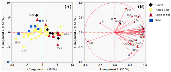 The Spearman correlation coefficients between any pair of variables (elements) for the sampled river sands are presented in Table 2. The PCA results for the variables are presented in Table 3 and depicted in the component pattern biplot of the first four principal components, as shown in Figure 4 and Figure 5 (A and B). The percentages of variance explained by the first, second, third, and fourth principal components were 56.04%, 13.10%, 7.72% and 5.63%, respectively. PC1 exhibited strong positive relationship with Ga, Co, Y, La, Pb, Th, Al2O3, Nb, Zr, Ni, Rb, MgO, Fe2O3, Na2O, P2O5, Zn, SiO2, Sc, Cr, TiO2, and K2O. In contrast, the negative PC1 scores had strong loadings for CaO and Sr. K2O, SiO2, Rb, Ba, and Zn showed relative enrichment in the positive values of PC2, while the negative PC2 scores were strongly associated with Sc, MgO, Fe2O3, Cr, and TiO2. MnO, Ba, and TiO2 showed strong positive correlations with PC3, while the negative PC3 values were strongly associated with Cu and Zn. In addition, PC4 exhibited strong positive correlations with Cu, Sr, Zn, and MnO.