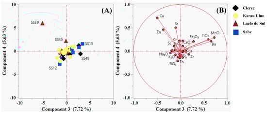 Samples (A) and variables (B) plotted on the third and fourth component axes of the PCA.