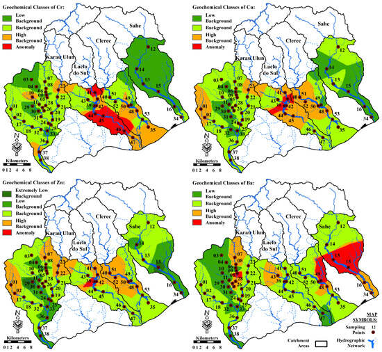 Distribution of geochemical classes for Cr, Cu, Zn, and Ba in the study area, derived from the boxplot model.