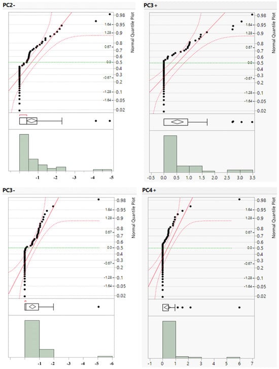 Distribution plots of the positive PC3 and PC4 scores, as well as the negative values of PC2 and PC3.
