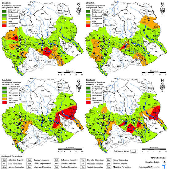 The elemental associations reflected in the positive PC4 scores could be significantly influenced by the presence of Cu-Zn deposits, as well as carbonate and manganese minerals [39,100,105]. Anomalous values of this component were identified in the midstream areas of the Laclo do Sul, Clerec, and Sahe River catchments (Figure 8). These anomalies were most pronounced in samples derived from rocks dominated by the Aitutu and Wailuli Formations, along with the Bobonaro Complex, indicating potential mineralization-related environments.
