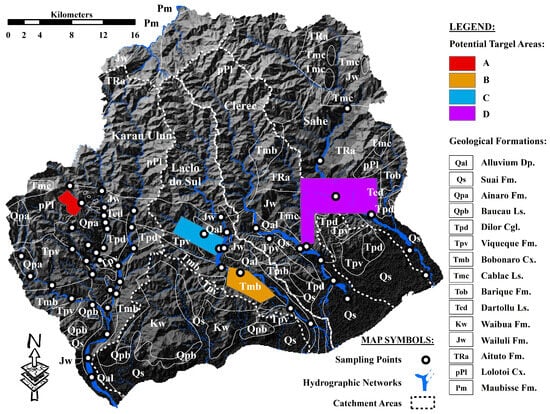 The occurrence of hydrothermal mineralization associated with the Gondwana Megasequence has been reported previously by Vicente et al. [39]. Further geochemical investigations and mineral exploration campaigns are recommended in areas underlain by the Wailuli Formation, particularly within the proposed boundaries of Target Area D (Figure 9). This area is considered a potential source of the detected Ba geochemical anomalies and may provide evidence of significant hydrothermal alteration of the associated rocks.