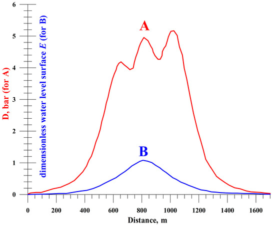 Dynamic pressure D (curve A) and dimensionless water surface level E (curve B) versus distance were calculated using Formulas (28), (29), and (22) according to the model of mega-tsunami in Lituya Bay.