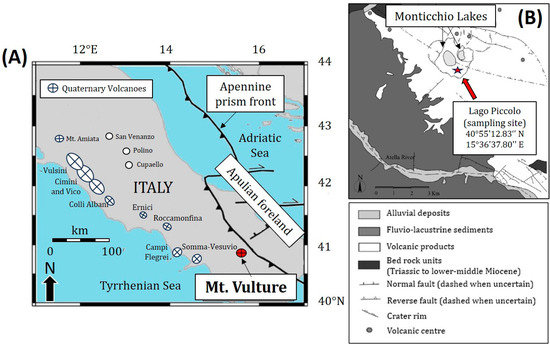 Location of Mt. Vulture and sampling site. (A) Mt. Vulture within the central-southern Italian peninsula with the Apennine prism front together with the peri-Tyrrhenian Quaternary volcanic alignment [20]. (B) Simplified geological sketch map and GPS coordinates of the sampling site (Monticchio Lakes Synthem, Lago Piccolo Subsynthem).