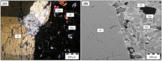 Petrographic details of a representative pelletal lapillus from Mt. Vulture volcano. (A) Crossed polars microphotograph and (B) backscattered electrons image showing the core (on the left) and the rim (on the right). Ol—olivine, Cpx—clinopyroxene, Hyn—haüyne.