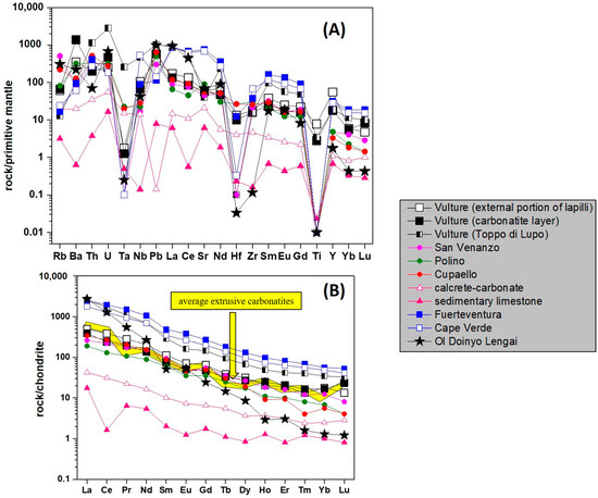 Abundance diagrams normalised, respectively, to primitive mantle and chondrite [22]. (A) Multi-element and (B) REE diagram showing patterns of the external portion of lapilli and the carbonatite layer. Patterns of Vulture Toppo di Lupo [20], San Venanzo, Polino, Cupaello [23], Ol Doinyo Lengai [24], Fuerteventura and Cape Verde carbonatites [25], sedimentary calcrete-carbonate fraction [26], and sedimentary limestone [27] are also depicted for comparison. Average extrusive carbonatites are from Stoppa’s research [28].