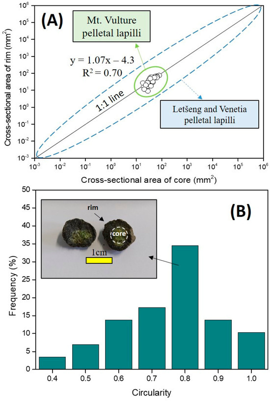 Geometric parameters of pelletal lapilli from Mt. Vulture. (A) Cross-sectional area of core vs. cross-sectional area of rim. Volcaniclastic Letšeng and Venetia deposits are also plotted for comparison [3]. (B) Histograms showing circularity values (i.e., 4π × area/perimeter2).