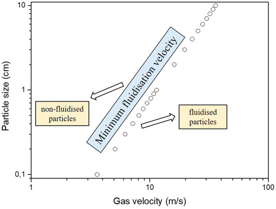 Particle size vs. minimum fluidisation velocity for studied Mt. Vulture pelletal lapilli fluidised by CO2 at 1100 °C. The graph shows the minimum fluidisation velocities required to fluidise and support a range of particle sizes (white circles).