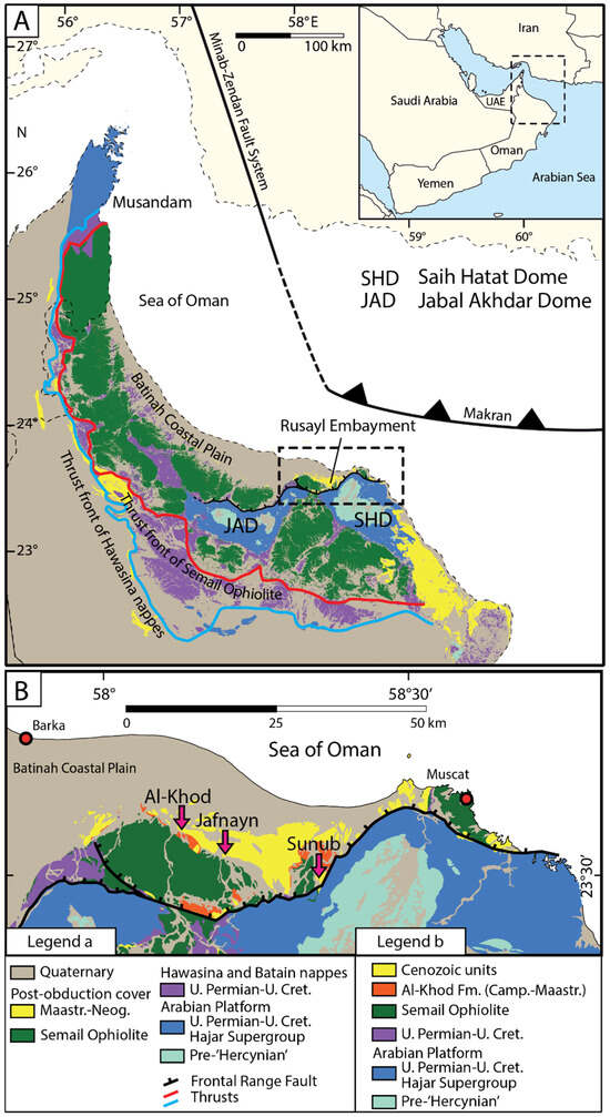 Location of the study area on geological maps. (A) Geology of the Oman Mountains. Box indicates map area shown in b. Modified after [8,9]. The Rusayl Embayment is the outcrop zone of the Al-Khod Formation and the Cenozoic formations north of the Jabal Akhdar and Saih Hatat domes. (B) Detailed map of the study site, located in the western part of the Rusayl Embayment, after Béchennec et al. [8]. Frontal Range after [10]. The three locations marked with red arrows are locations in the Rusayl Embayment mentioned in the text.
