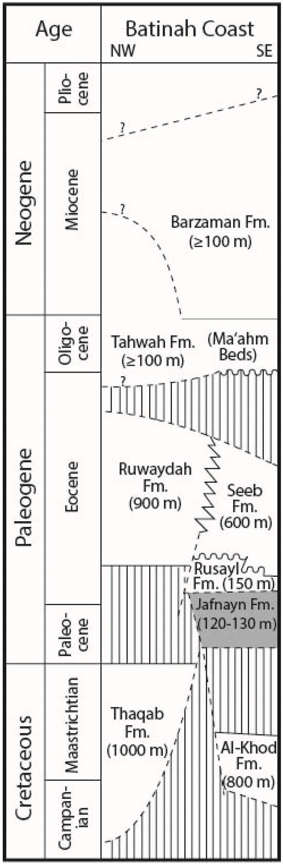 Stratigraphic overview of the Late Cretaceous and Cenozoic post-obductional formations of the study area, mainly after [1,11]. The thickness of the Rusayl Formation may vary greatly from region to region [1].