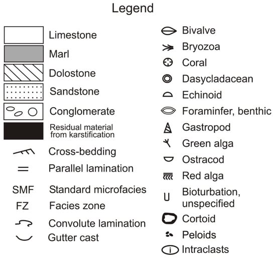 In the upper part of the studied section, SMF 8 and SMF 18-DASY are associated with SMF 18-FOR. Therefore, it is possible that SMF 18-FOR may represent FZ 7 in the upper part of the section (see above). In this case, open marine conditions in the upper part of the studied section could be more widely distributed, as shown in Figure 16. Increasing open marine conditions towards the top may also be reflected by an increase in coral debris in the same direction (Figure 4, Figure 7, Figure 9, Figure 11 and Figure 16). However, the multi-faceted research approach by Dill et al. [12] indicated a shallow lagoon with moderately reducing conditions for the uppermost part of the studied section, favoring the idea of a restricted environment. All ostracods, including those of log segments 3 and 4, indicate low-energy conditions, which goes along better with restricted than with open marine conditions. In addition, the peloids in the peloidal grainstones and packstones of SMF 16 (log segments 3 and 4) and their indication of reduced sedimentation rates [61] also tend to favor restricted over open marine conditions. Thus, we prefer the interpretation that the upper part of the section was also dominated by restricted environments.