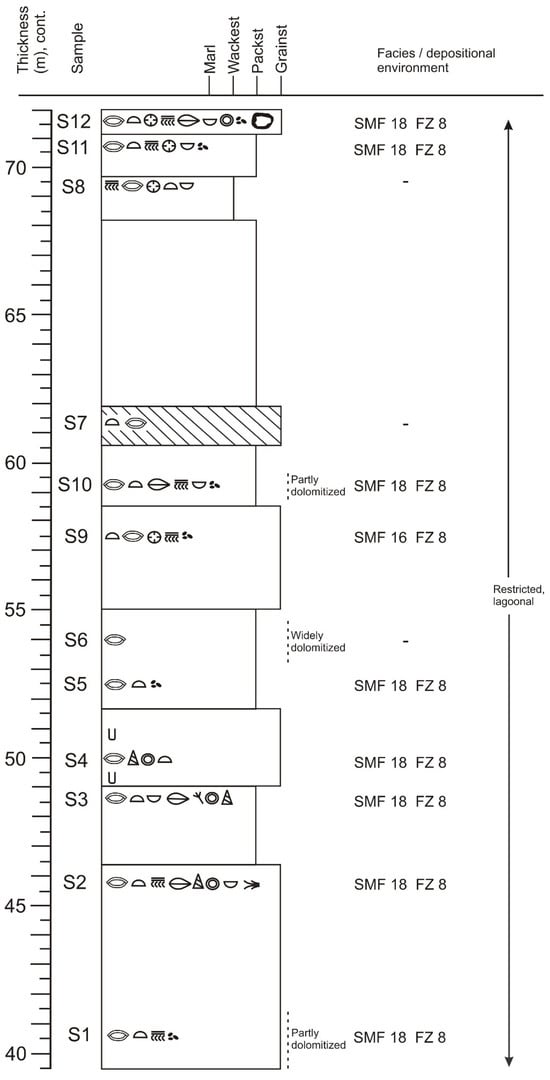 We recognized four SMF types: SMF 18-FOR (Figure 6B), SMF 16 (Figure 6B), SMF 18-DASY (Figure 10D), and SMF 8 (Figure 10A–C), the most common of which is SMF 18-FOR. In general, SMF 18 may indicate a restricted (FZ 8) or an open (FZ 7) marine environment [15]. Because SMF 18-FOR is associated with the common SMF 16 (especially in the lower part of the section; Figure 1 and Figure 2), which represents FZ 8, we suggest that SMF 18 also indicates FZ 8. Facies zone 8 denotes a restricted lagoonal environment with water depths reaching a few tens of meters within the euphotic zone [15]. Thus, the formation predominantly represents a restricted lagoonal environment (Figure 4, Figure 7, Figure 9, Figure 11 and Figure 16).