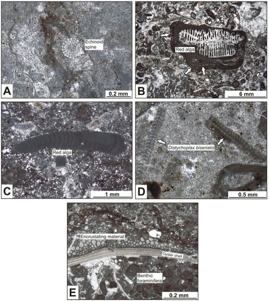 Thin-section analyses are summarized in Table A1 of Appendix A with identified foraminiferan taxa. Most thin-sections display foraminiferal grainstone textures (Figure 6B) prevailing over finer grained peloidal grainstones (Figure 6C). Detrital quartz occurs sporadically in the lower 22 m (Figure 4 and Figure 6D). Overall, benthic foraminifera are the most common bioclasts, followed by echinoids. Less common are dasycladacean green algae (Figure 6E) and smooth-shelled ostracods (Figure 6E). Bivalves are rare. Although gastropods were observed with the naked eye in the field, they were not found in thin-sections. Foraminifera can be sizeable, often reaching 3–4 mm in diameter, and a few echinoid fragments measure several mm in length. Miliolids also occur as “small” foraminifera (<0.5 mm; [15], p. 458). Non-skeletal grains (peloids and cortoids) generally occur in limited numbers, except in grainstone textures, where they dominate. Peloids are much more common in the upper part.