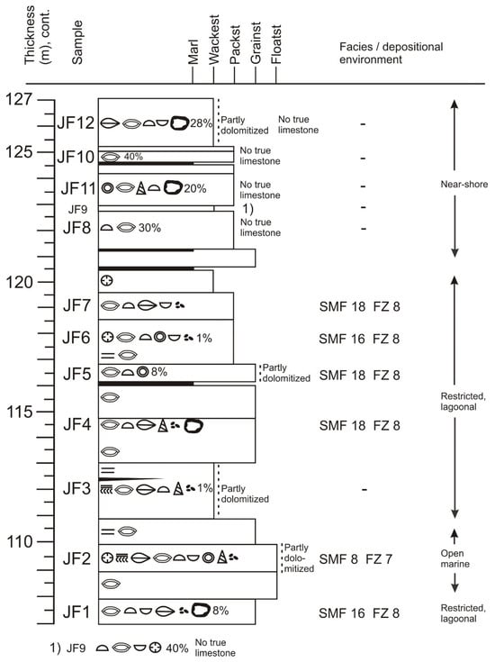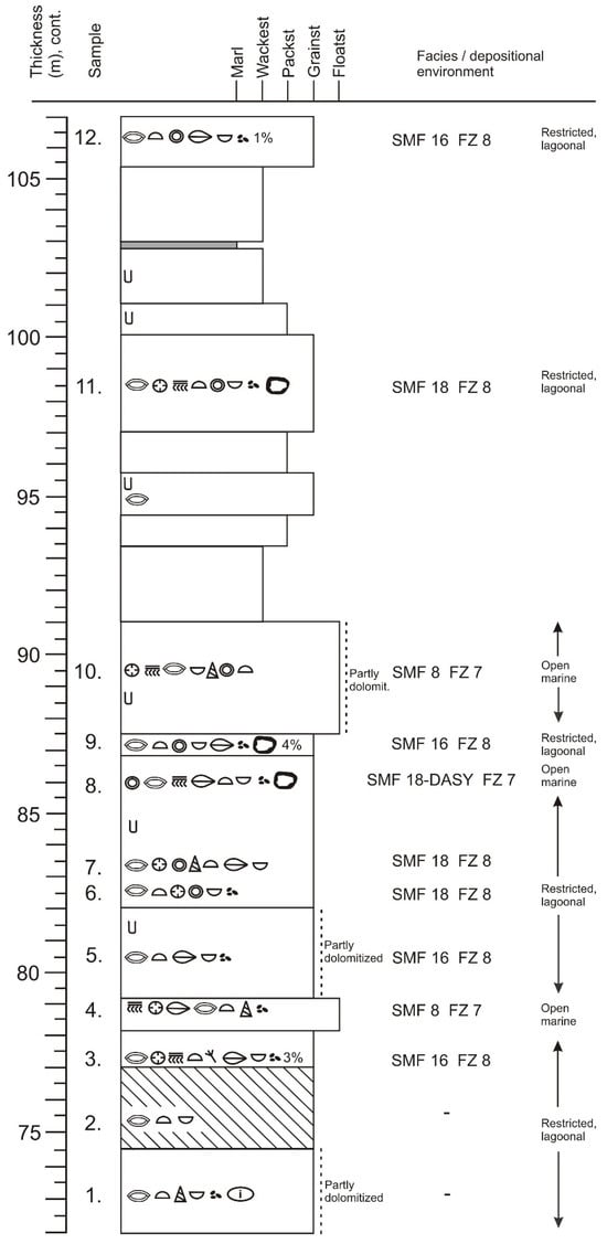 In summary, the lower part of this succession is characterized by a few thin-to-medium marl layers, detrital quartz, and low faunal diversity, while the upper part displays more thickly bedded, cleaner carbonates with higher faunal diversity (Figure 4). SMF 18-FOR is the dominant microfacies.