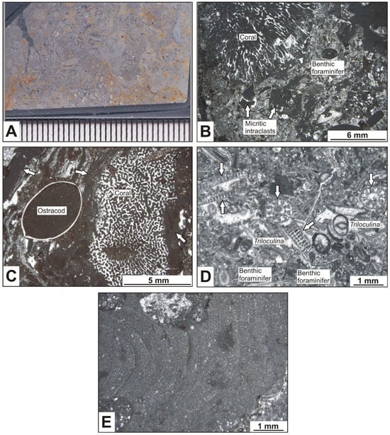 Digital scan of thin-section (A) and thin-section photomicrographs (B–E) of samples from Log Segment 3. (A) Digital scan of a thin-section of a coral–red algae floatstone allowing observation of the floatstone texture. The sample represents SMF 8. A black background was used to optimize the contrast to demonstrate the floatstone texture. The ruler at the bottom has millimeter spacing. Sample “4.”. (B) Poritid coral and micritic intraclasts in coral–algae floatstone next to benthic foraminifer, representing SMF 8. Dasycladacean grainstone, Sample “4.”, PPL. (C) Red algae (arrows), encrusting poritid coral, representing SMF 8. Sample “10.”, PPL. (D) Dasycladacean (group Thyrsoporelleae) grainstone with benthic foraminifera, including Triloculina sp., representing SMF18-DASY. Dasycladaceans are marked by arrows. Sample “8.”, PPL. (E) Corallinacean red alga. Peloidal grainstone, representing SMF 16. Sample “3.”, PPL.