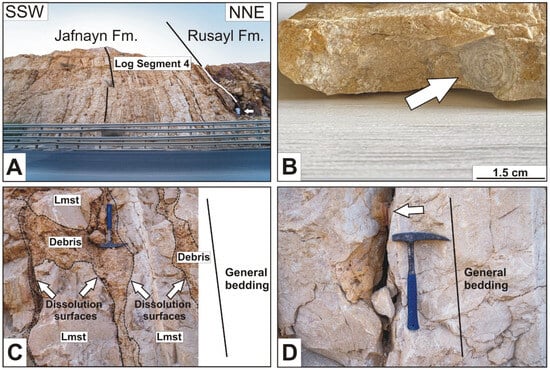 This log segment extends from 107 to 127 m above the base of the logged section and is dominated by thick-bedded and very thick-bedded limestones (Figure 11 and Figure 12A). Corals, bivalves, ostracods, and, occasionally, sizeable LBF (Figure 12B) can be seen in the field. Sedimentary structures are rare, with parallel lamination observed in a few places. Very coarse quartz sand including a few quartz granules was observed in the upper few meters of the formation (Figure 11). Five “horizons” of reddish/brownish residual material from karstification were recognized (Figure 11 and Figure 12C,D). They may display parallel lamination and seem to broadly follow the general bedding, although some thickness changes are recognized as well as dissolution features that are clearly non-parallel to bedding (Figure 12C,D). Field evidence did not provide any clues as to the type of karstification (syn- or post-depositional). In the field, detrital quartz grains were observed in the top ~10 m. The contact to the overlying Rusayl Formation is well-exposed (Figure 12A). It is marked by an abrupt depositional change from limestone (Jafnayn Formation) to marl (Rusayl Formation) (Figure 12A).