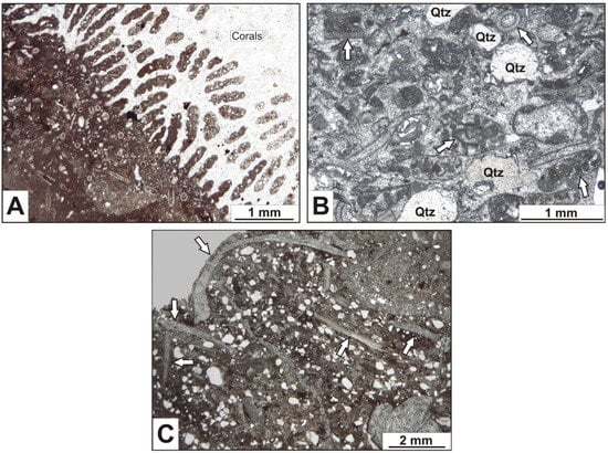 Thin-section photomicrographs of samples from Log Segment 4. (A) Corals are the most frequent bioclasts of a coral–red algae floatstone, representing SMF 8. The bioclasts in the micrite are mainly dasycladaceans in different sections. Sample JF2, PPL. (B) Quartz arenitic limestone with dasycladaceans (arrows) is the most frequent bioclast type. Most of the detrital quartz debris is marked as “Qtz”. Sample JF11, PPL. (C) Quartz arenitic limestone with bivalves (arrows) is the most common bioclast. The white components are detrital quartz grains. Sample JF12, PPL.
